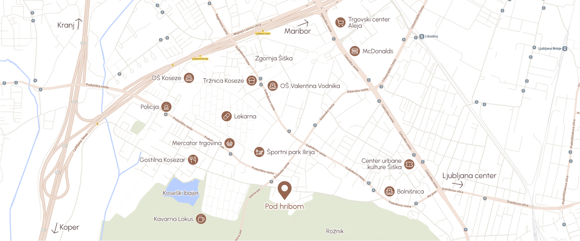 Soseska Pod hribom združuje najboljše iz dveh svetov: spokojnost naravnega okolja in priročnost mestne bližine. V nekaj trenutkih se lahko umaknete na senčne poti Rožnika ali v objem parka Tivoli, medtem ko vas urbana doživetja čakajo le kratek sprehod stran. Vse ključne storitve – od šol in trgovin do prijetnih kavarn in raznolike kulturne ponudbe – so tik ob vas, zato vsakdan poteka lahkotno.